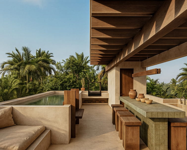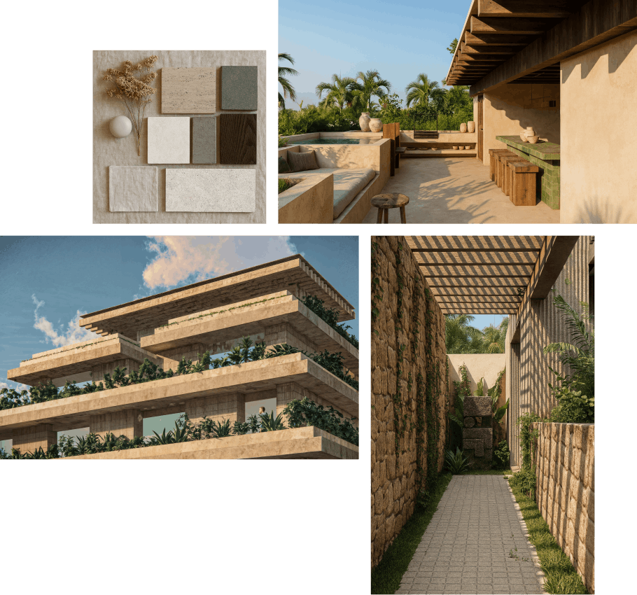 Travertine, tzalam, stucco, and handcrafted finishes reflect the textures and tones of Cozumel. These materials age gracefully, reinforcing a sense of permanence and authenticity.