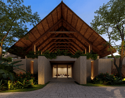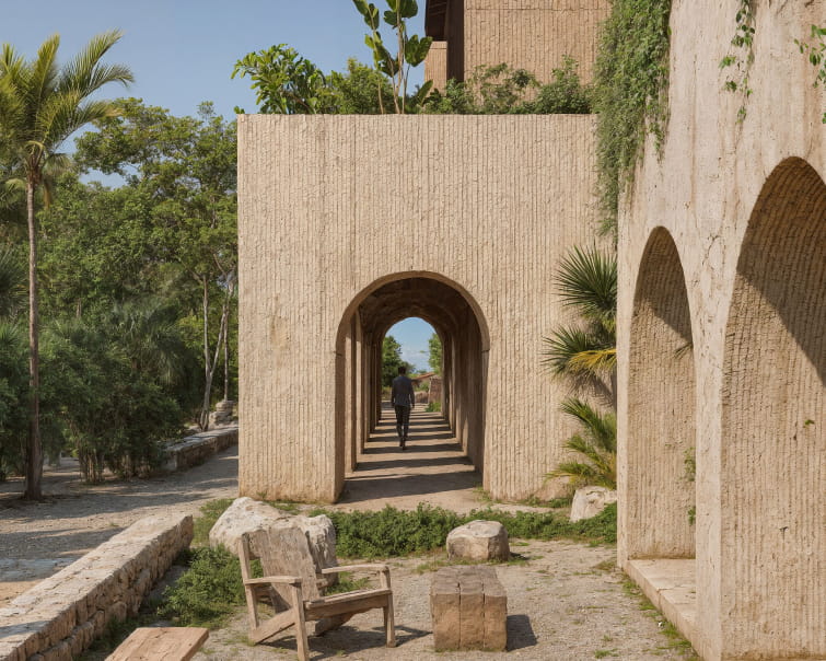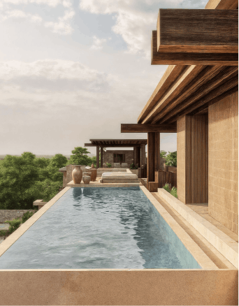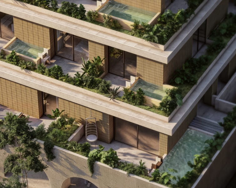 Three residential pyramids and fifteen private villas form the heart of the project, each designed to rise naturally from the land rather than compete with it. Stucco, stone, textured concrete, and warm tropical woods create a material palette that feels true to the island and grounded in its history.