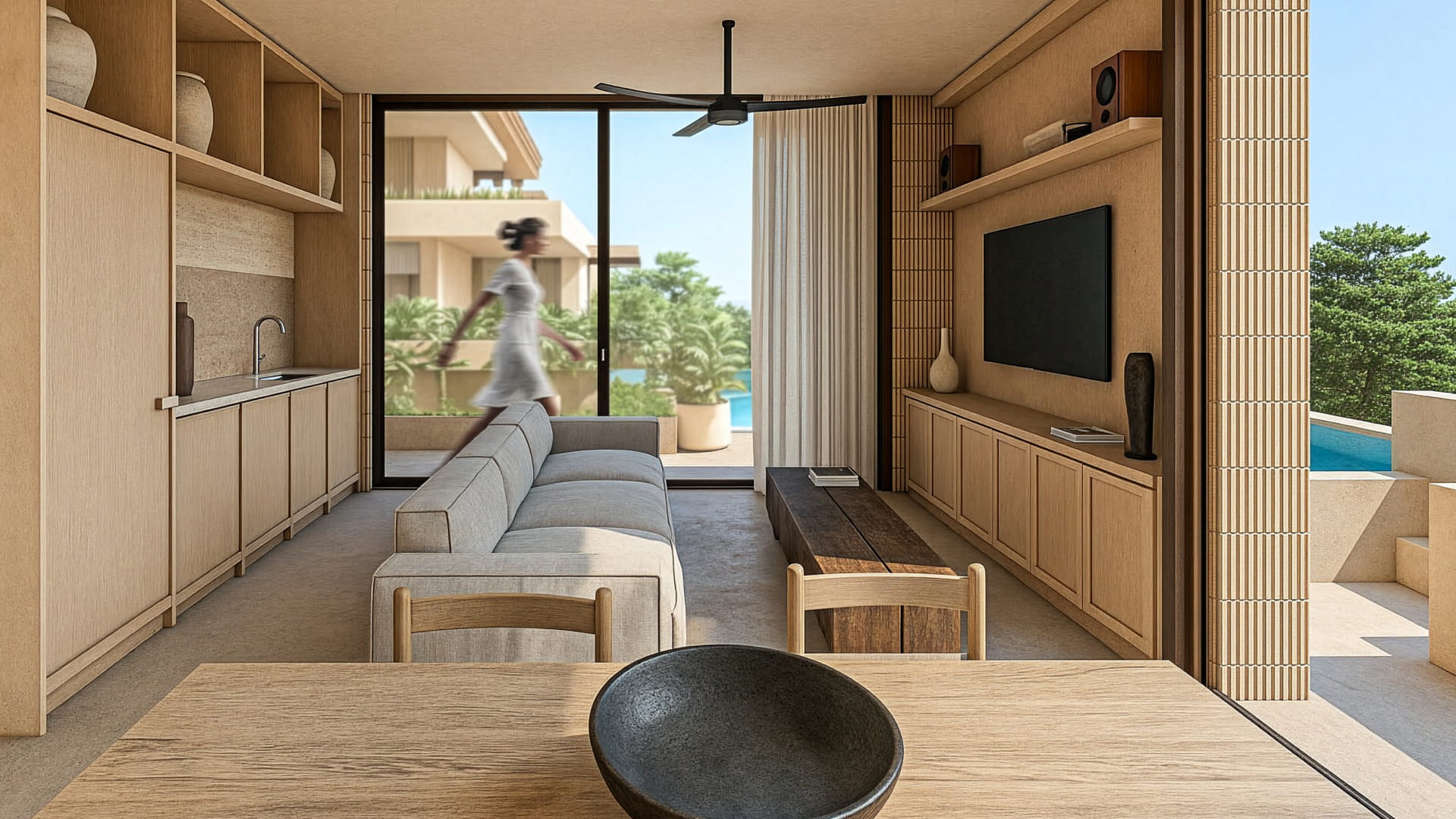 The apartments are located within Anamaya’s three residential pyramids. These buildings draw inspiration from Mayan geometry and are arranged to welcome airflow, natural light, and views toward the southern coastline. Each pyramid contains ten residences distributed across three levels, with private terraces that extend the living spaces outdoors.