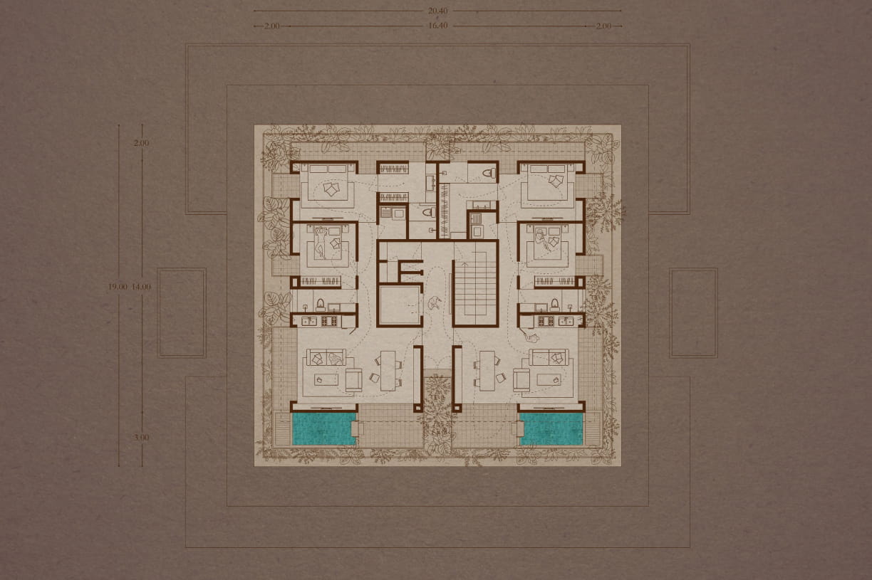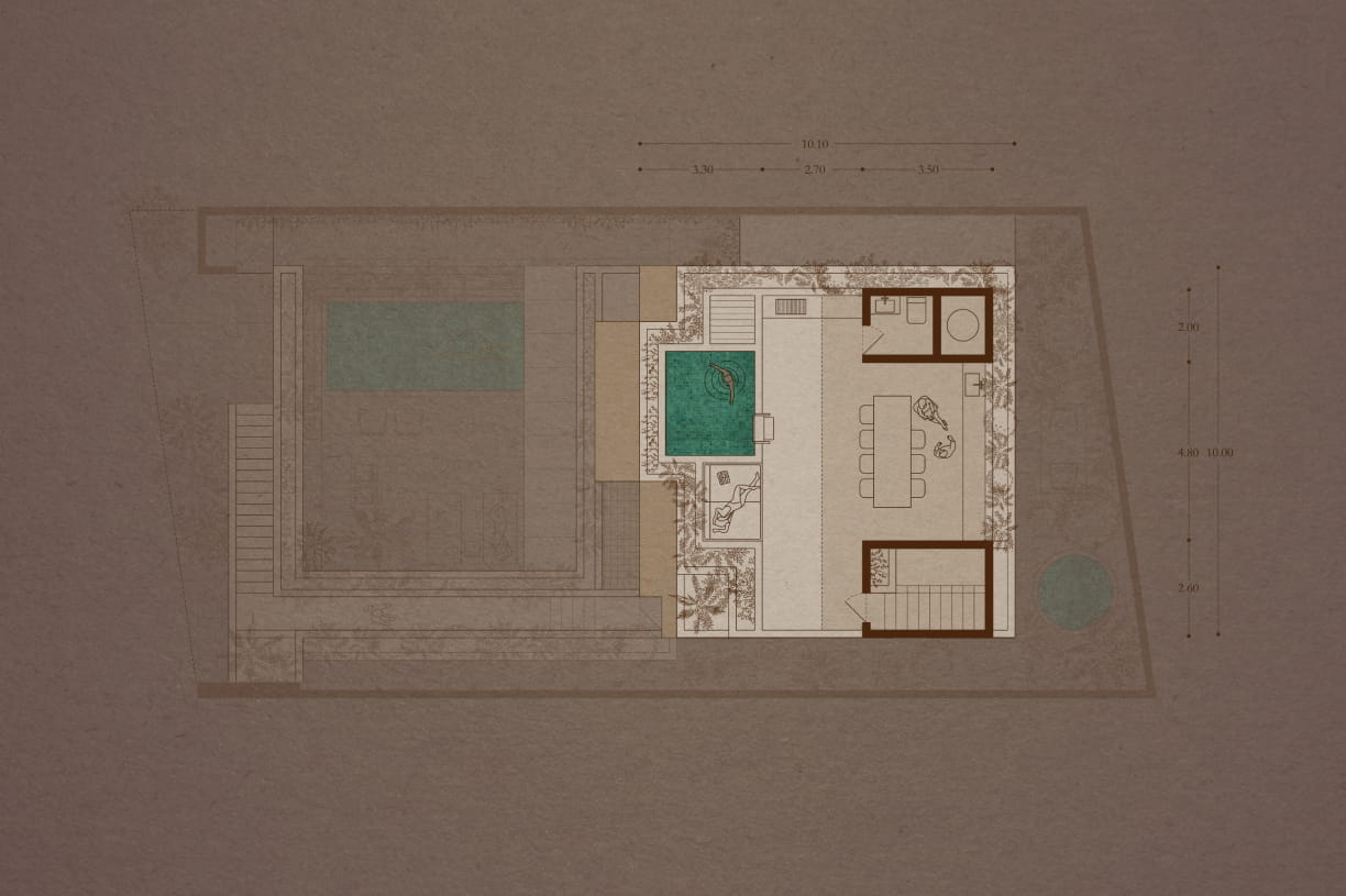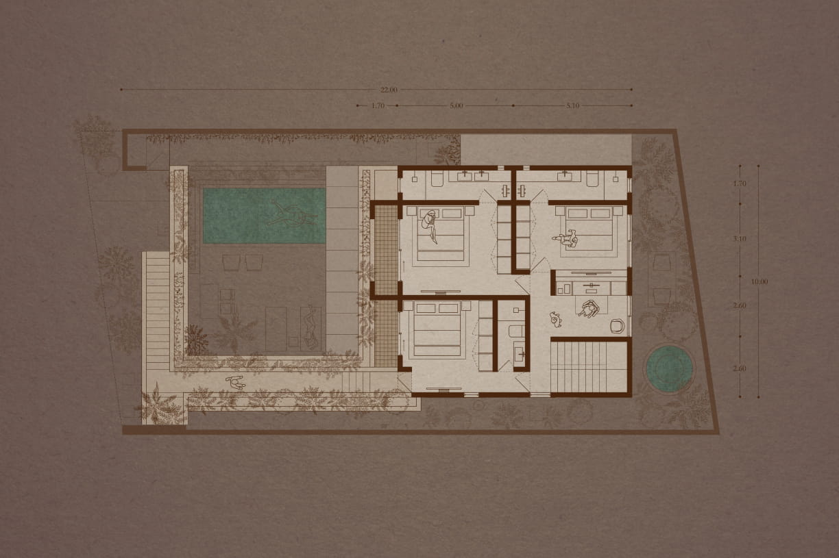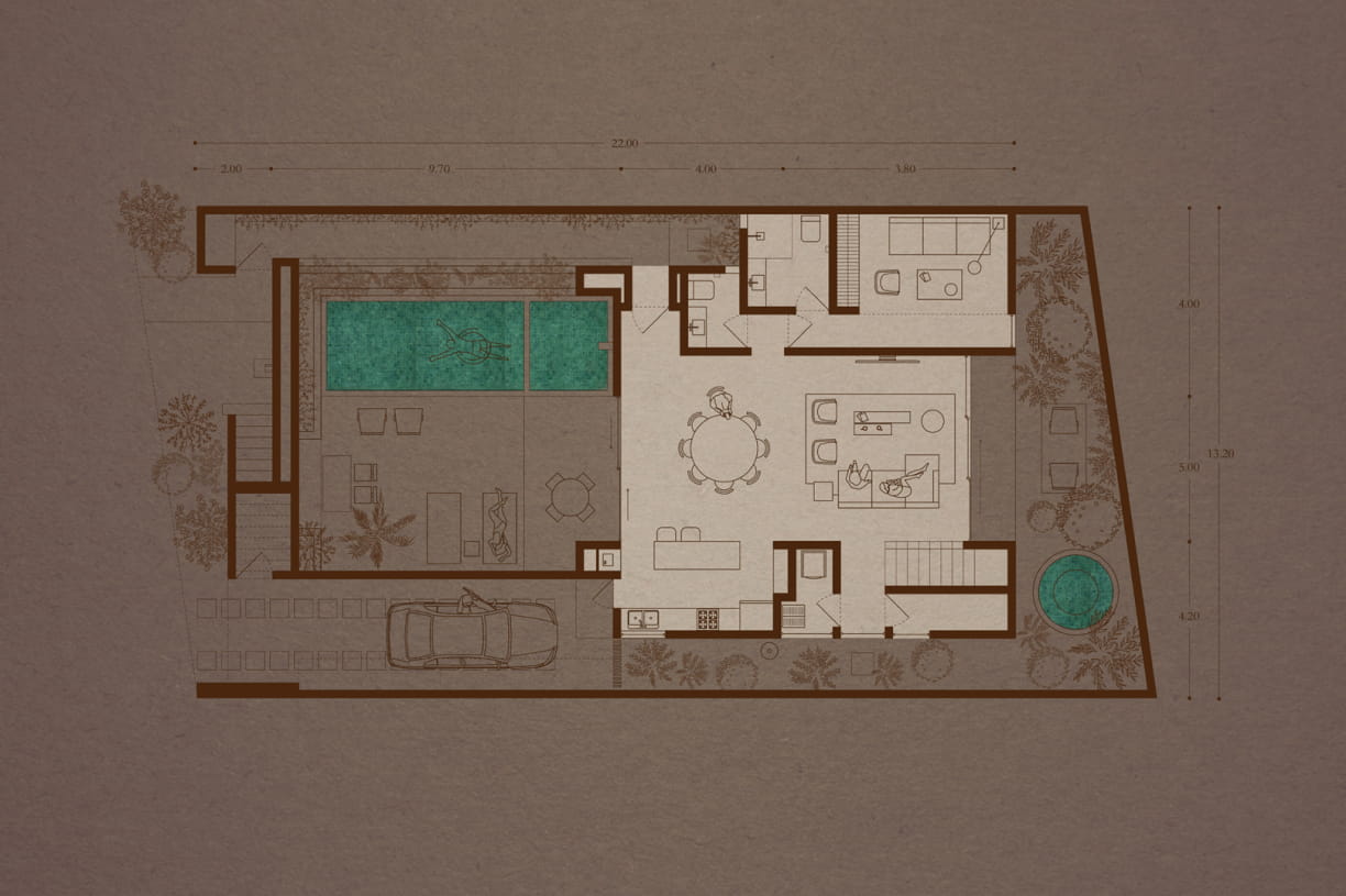 The villas at Anamaya offer a private residential experience shaped by space, comfort, and a strong connection to the landscape. Each home includes three bedrooms, generous interior spaces, and two gardens with a pool, creating a natural flow between indoor and outdoor living. An interior courtyard brings light and vegetation into the center of the home, while the rear garden offers quiet spaces for rest and family gatherings.