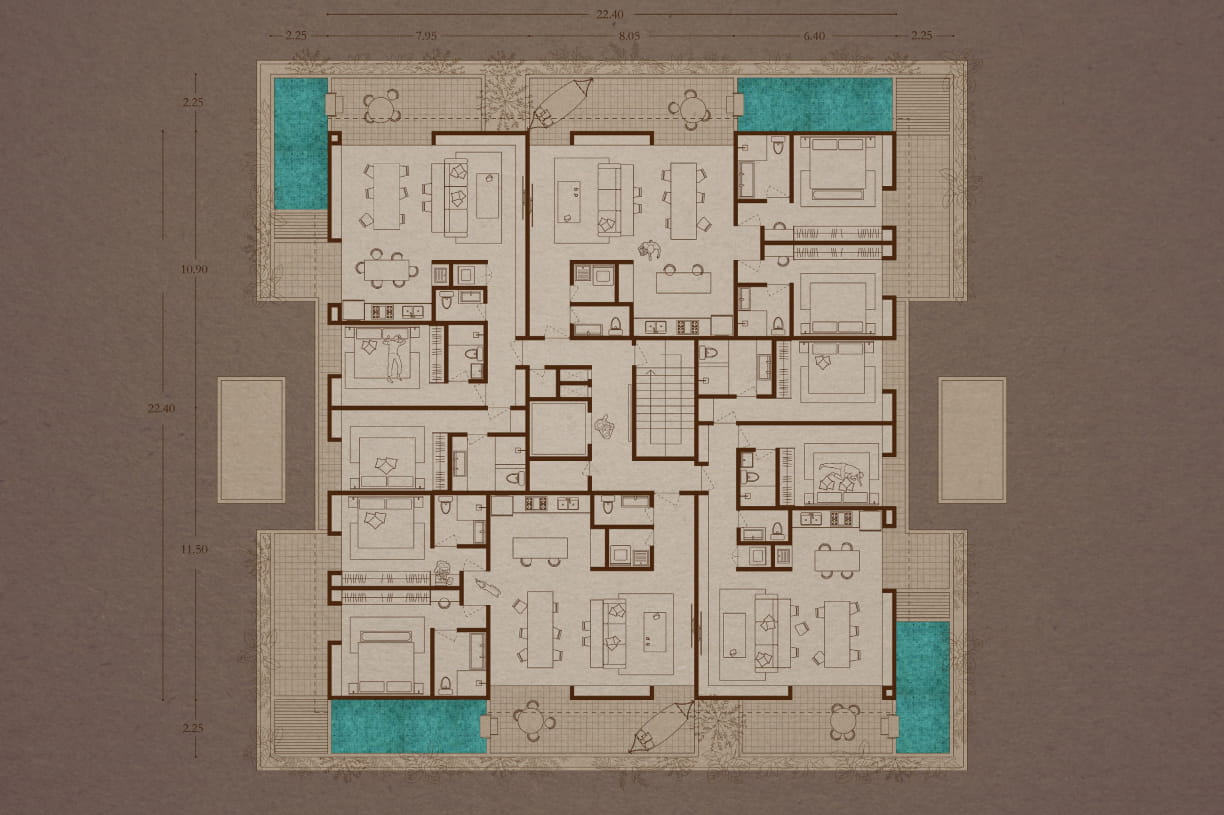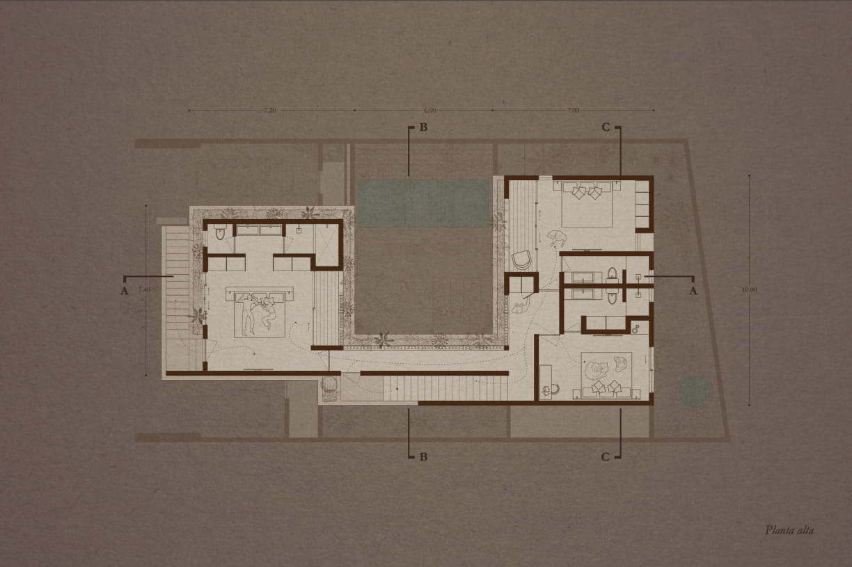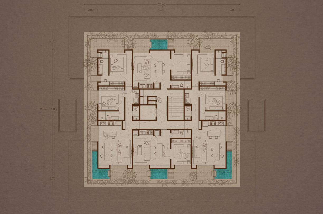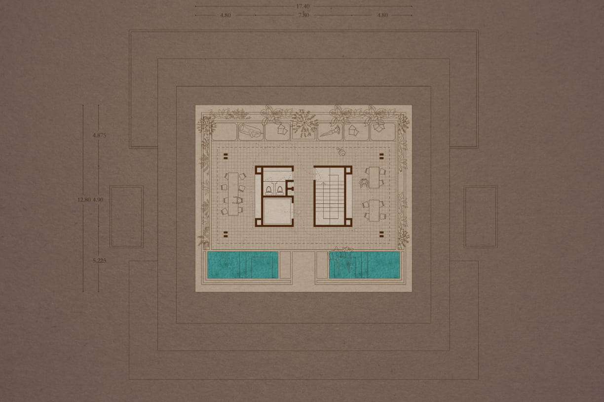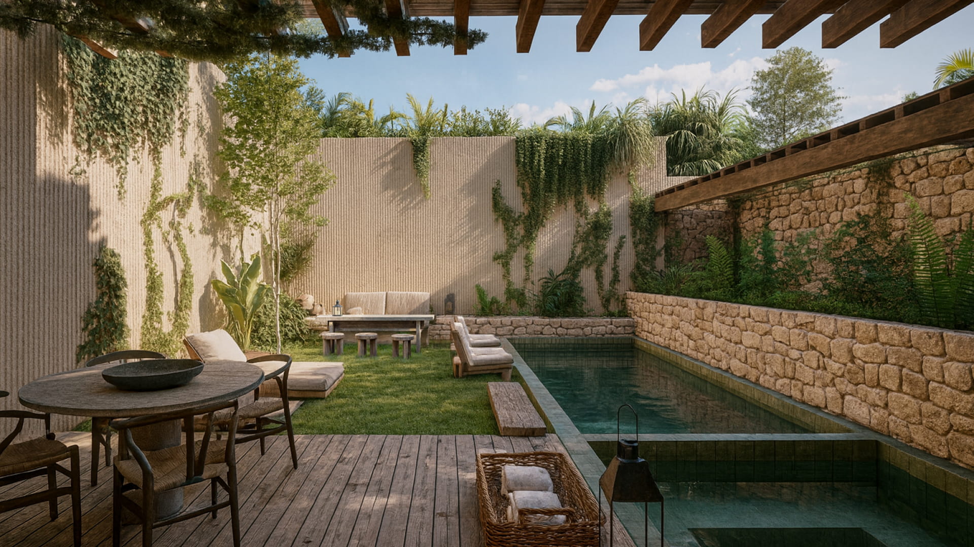 The villas at Anamaya offer a private residential experience shaped by space, comfort, and a strong connection to the landscape. Each home includes three bedrooms, generous interior spaces, and two gardens with a pool, creating a natural flow between indoor and outdoor living. An interior courtyard brings light and vegetation into the center of the home, while the rear garden offers quiet spaces for rest and family gatherings.