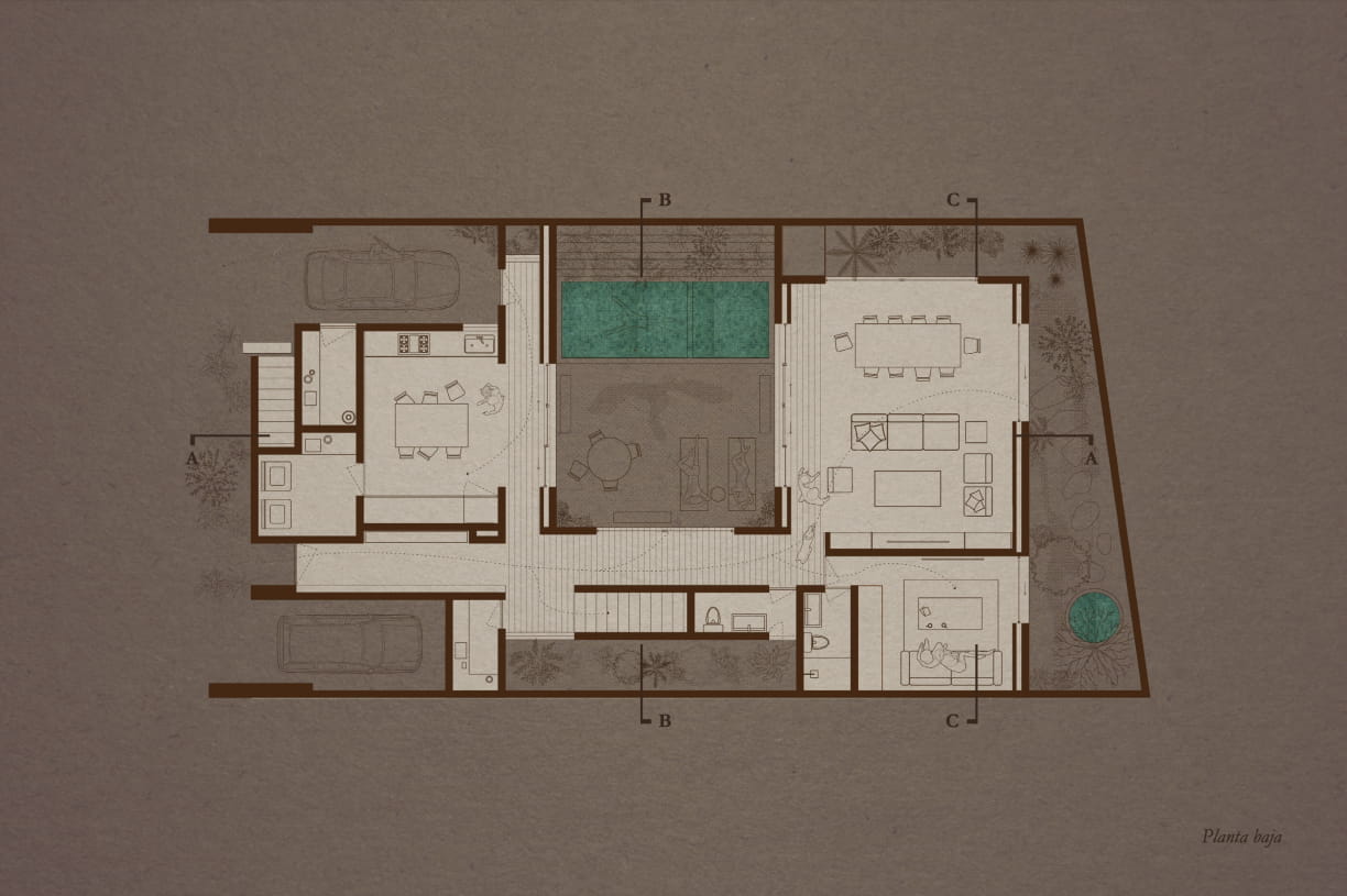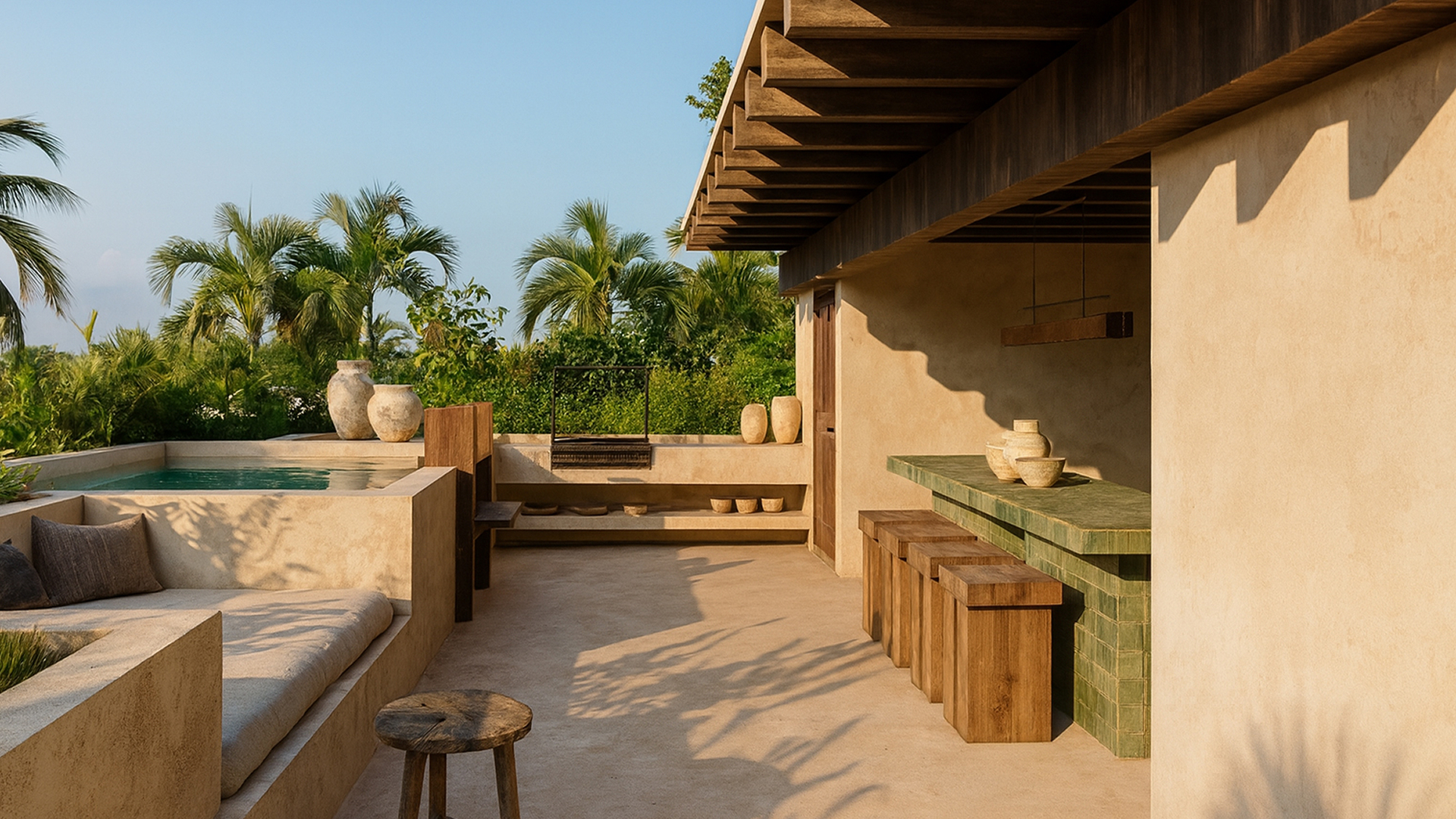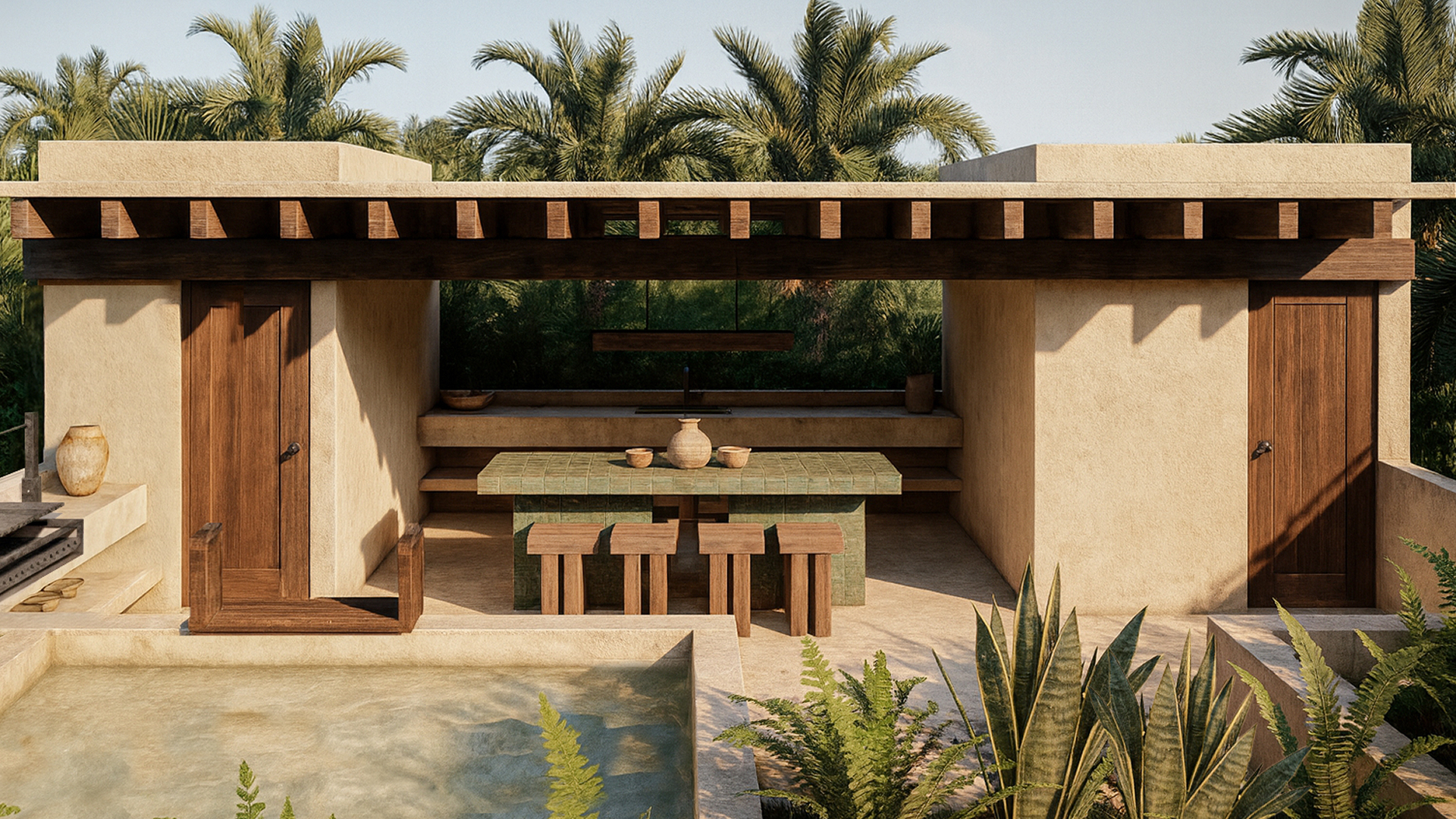 These materials were chosen for their durability, tactile quality, and ability to age gracefully in Cozumel’s coastal climate. Their earthy tones echo the surrounding landscape and reinforce the connection between the built and natural environments.