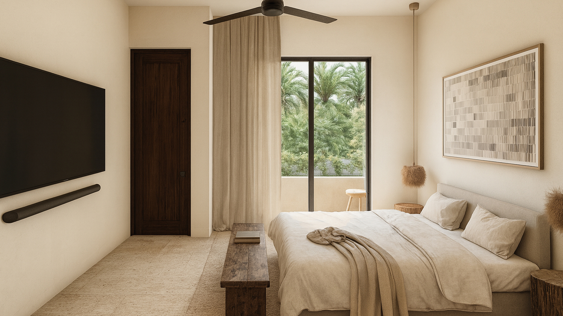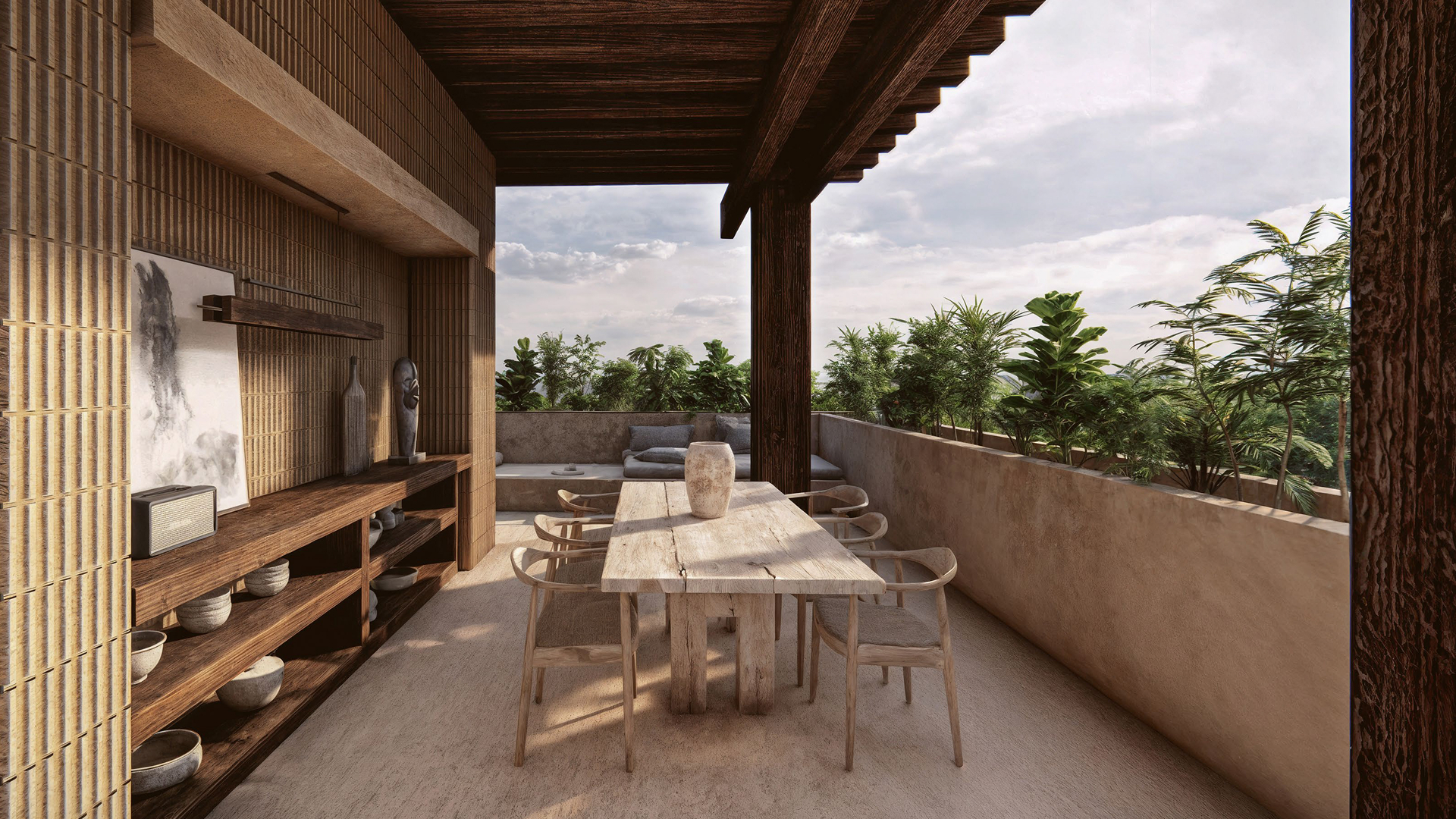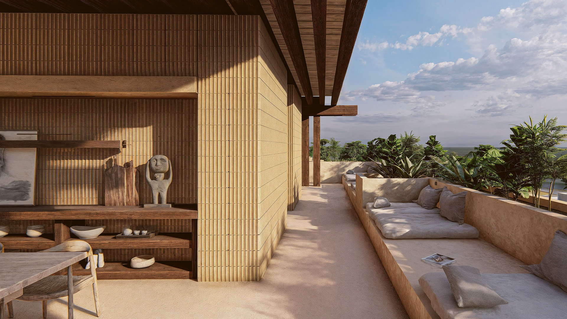 Artisan finishes, natural stucco, stone, and warm woods create a natural, welcoming atmosphere in the villas. A rooftop terrace offers elevated views and a place to enjoy Cozumel’s climate throughout the day.